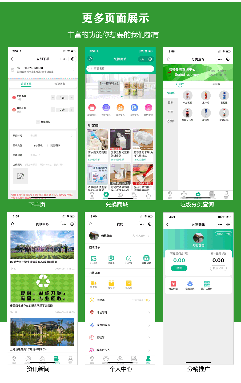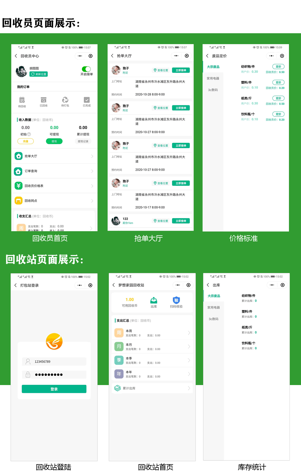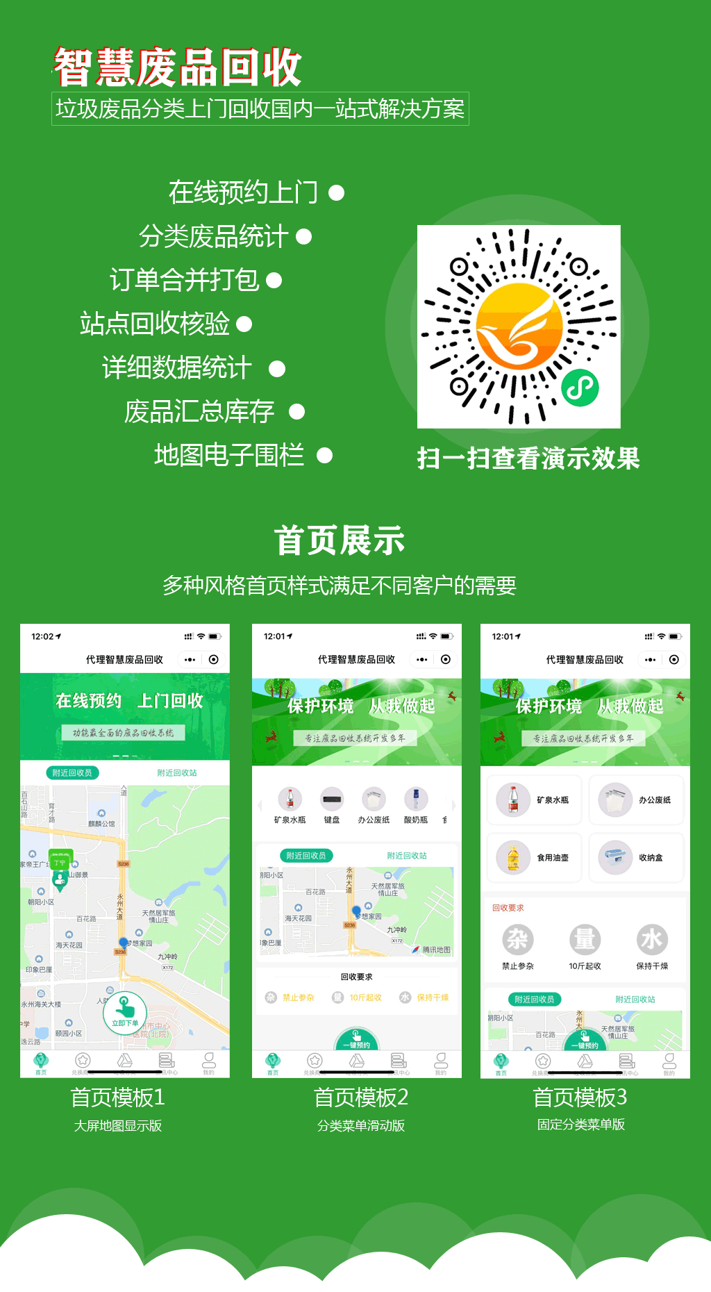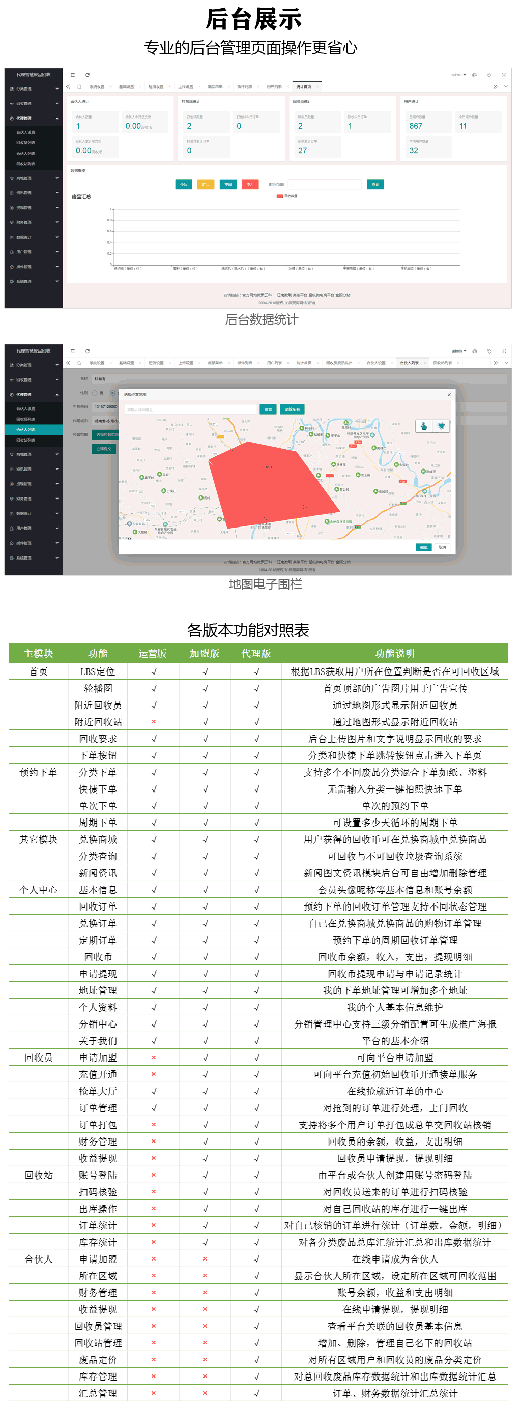 1、線上上門回收:不需要硬件設(shè)備,不需要建立投遞流程,全部上門回收,不需要環(huán)保回收袋,只是每次上門回收的時候,用戶掃碼綁定下訂單,回收后的數(shù)據(jù)由后臺進(jìn)行錄入上傳,再反饋到用戶端數(shù)據(jù)展示及其他操作。